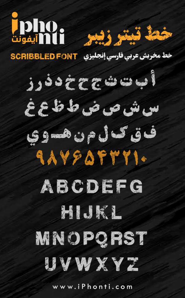 خط تيتر زيبر المخربش عربي فارسي إنجليزي .. هو خط رسومي مميز، تم ابتكاره بتغيير شكل الخط الصامت وإضافة نسيج إليه.